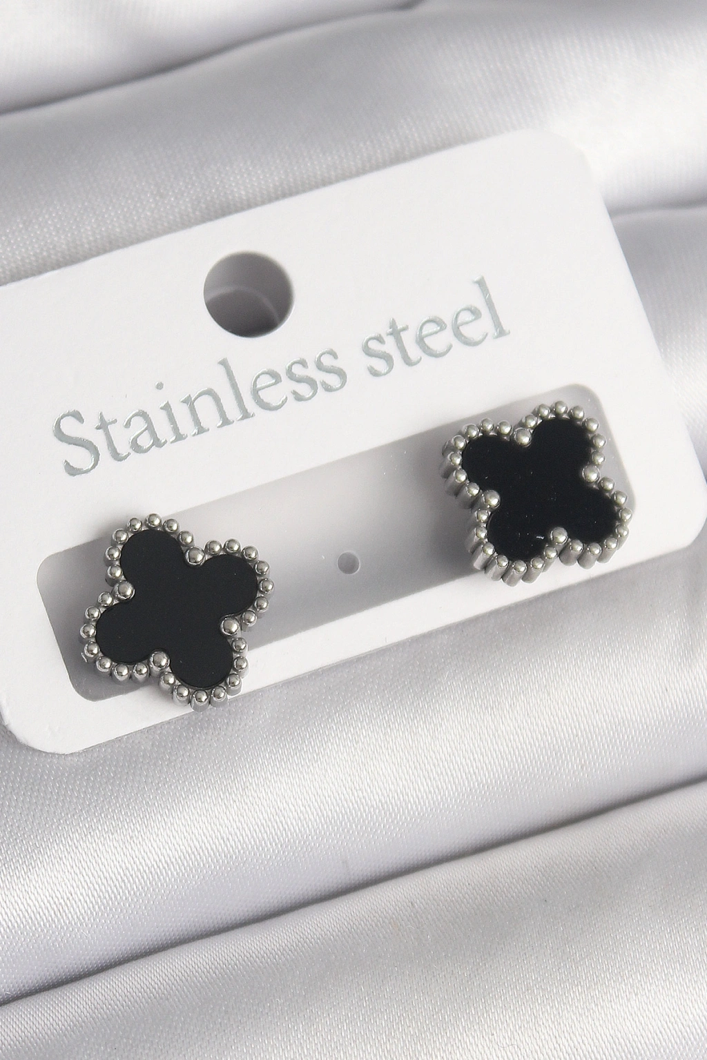 316L Çelik Gümüş Renk Siyah Yonca Model Kadın Küpe