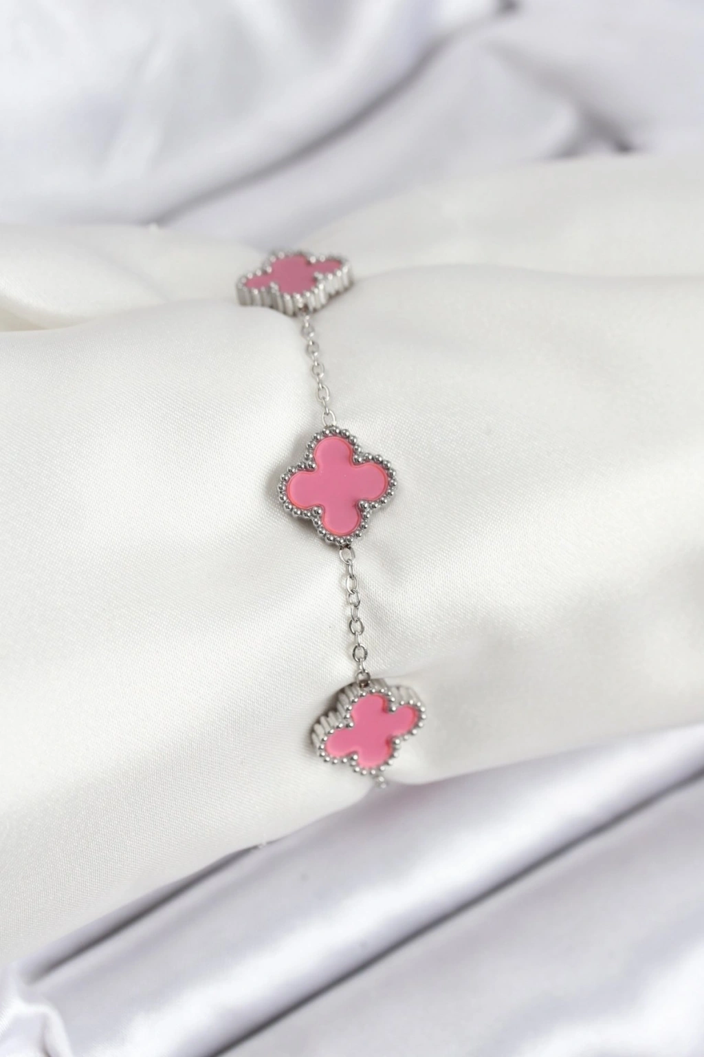 316L Çelik Gümüş Zincir Pembe Renk Yonca Bileklik