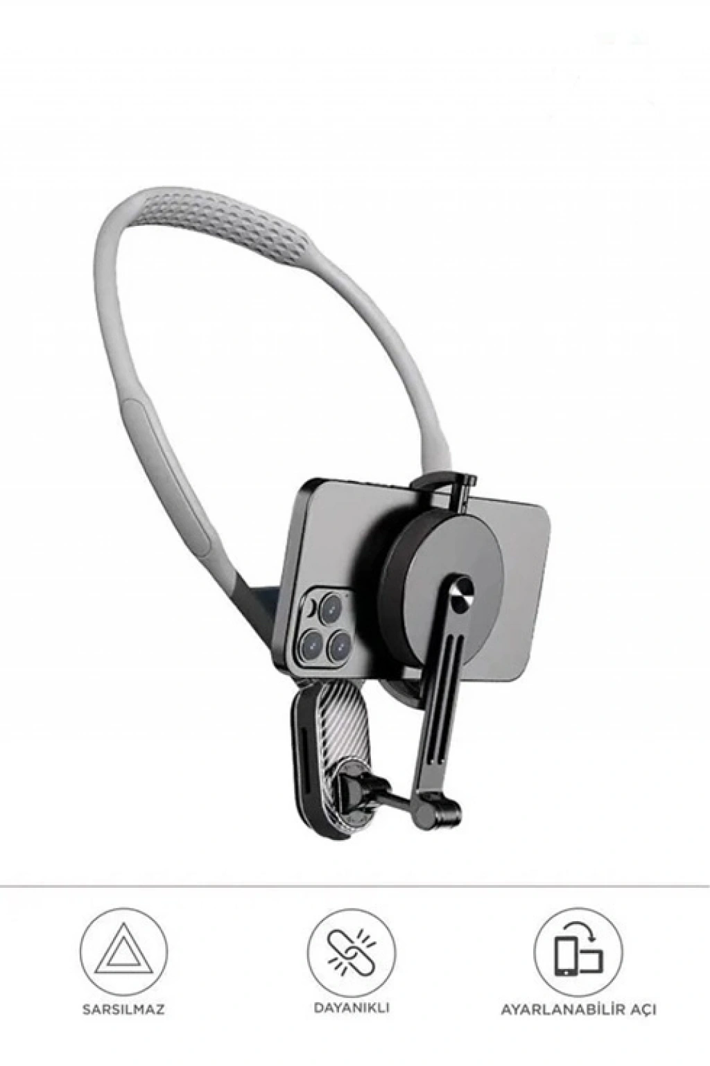 eller serbest bir deneyim sunarak video izleme, içerik izleme, çevrimiçi ders veya video aramalar sırasında rahatlık sağlayan, boyuna asılabilen bir manyetik telefon tutucudur. 360 derece dönebilir ve ayarlanabilir yapısıyla istenilen açıya kolayca uyum sağlar. Boyuna asılabilir olması sayesinde uzun süreli kullanımlarda bile konfor sunar ve boyun ağrısını azaltmaya yardımcı olur.
